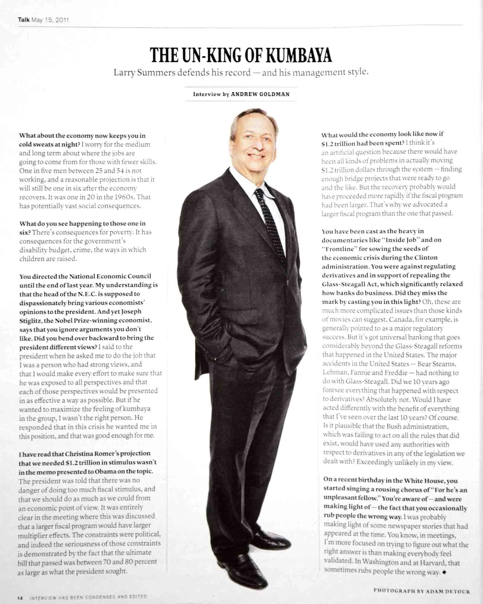 ...well, my picture was anyway. I'm honored to have had the opportunity to shoot a portrait of economist Larry Summers for the New York Times Sunday Magazine. The Times asked me to shoot it in my usual style, so with the technical aspects well in hand, my biggest concern was whether to call him Mr. Summers or Dr. Summers. Things that, to me, are far more complex than f-stops and shutter speeds any day. In the end we settled on Larry.