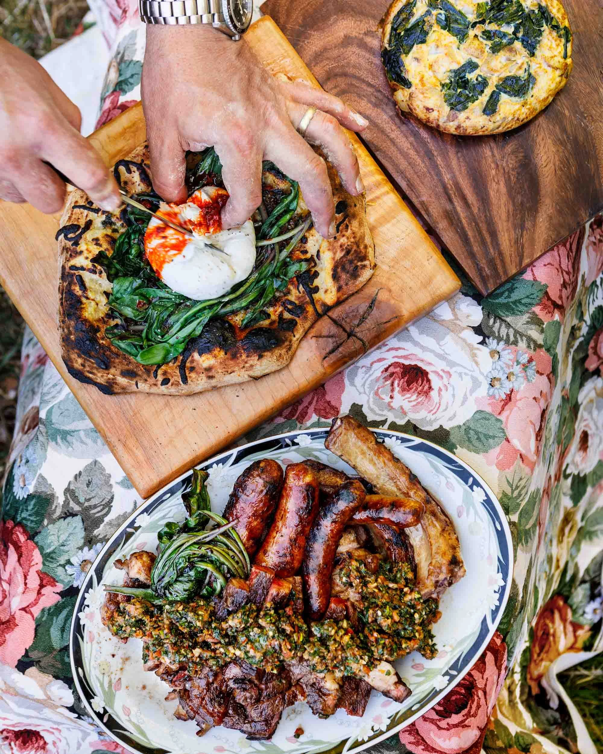 With our bounty in hand, we made our way to a clearing where Jared set up a small outdoor cooking station. Watching him and Tracy work with such skill and intuition was mesmerizing. Jared prepared an incredible charred ramp salsa verde, which he served over Vermont wagyu beef, while Tracy made a Spanish-style ramp tortilla—simple, elegant, and bursting with flavor.